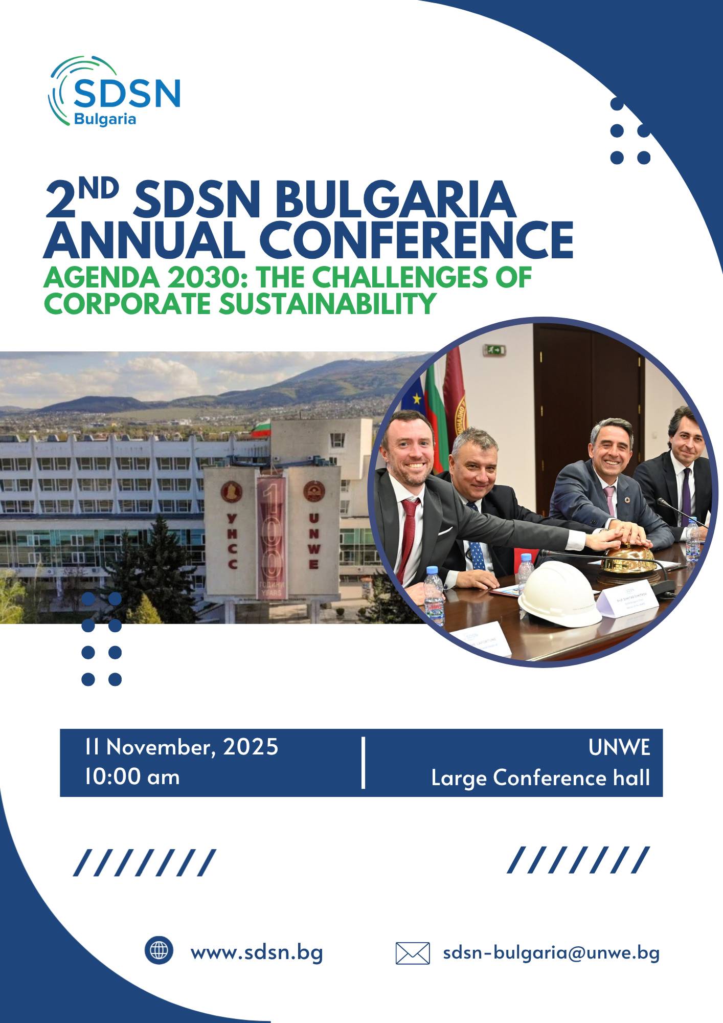 На 11 ноември 2025 г., от 10:00 ч., в голямата конферентна зала на УНСС ще се проведе Втората годишна конференция на SDSN България, под надслов „Дневен ред 2030: Предизвикателствата пред корпоративната устойчивост“.