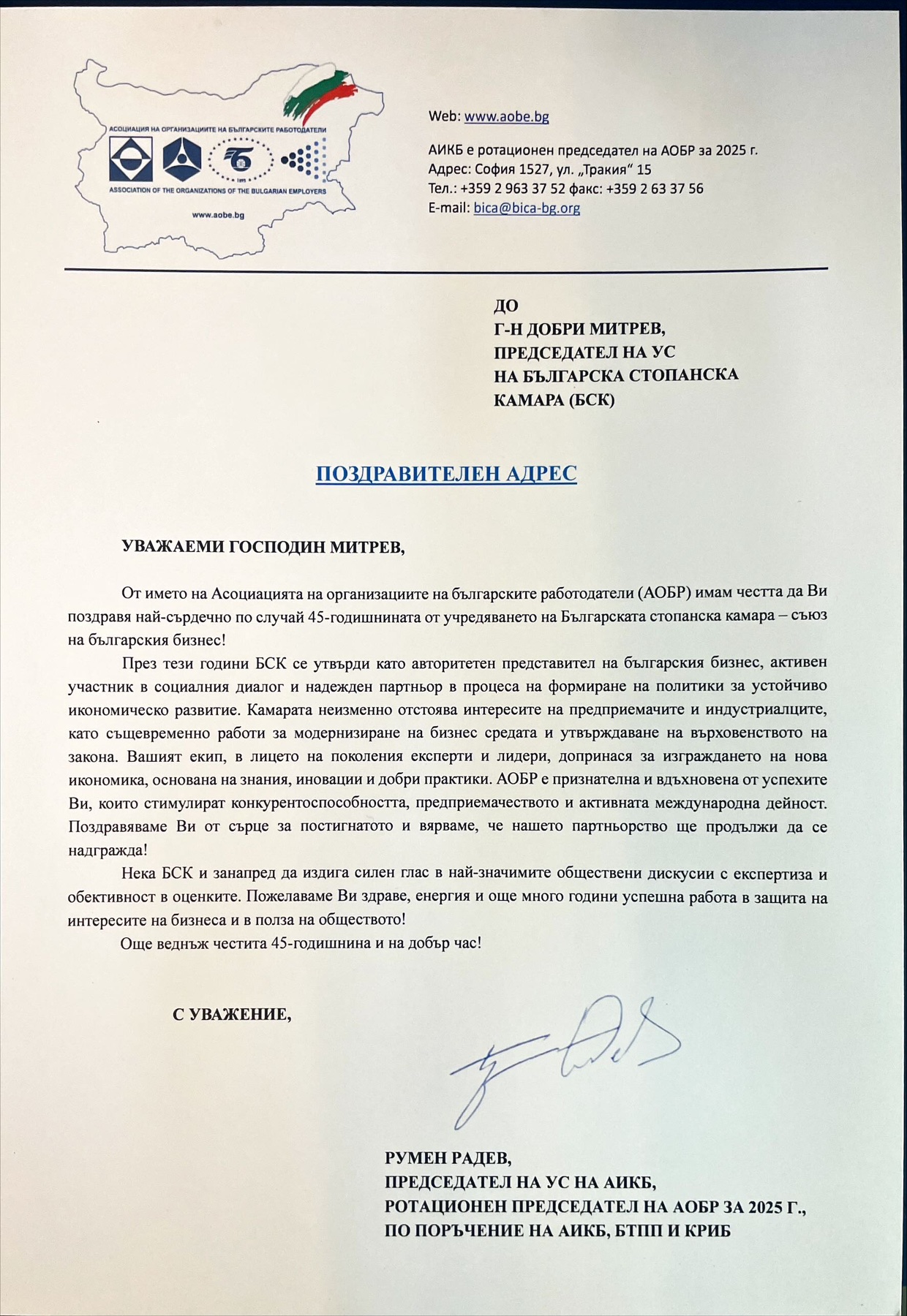 „За тези 45 години БСК се утвърди като авторитетен представител на българския бизнес, активен участник в социалния диалог и надежден партньор в процеса на формиране на политики за устойчиво икономическо развитие. Поздравявам целия екип – поколения експерти и лидери, и вярвам, че ще надграждаме нашето партньорство!“, каза Румен Радев, ротационен председател на Асоциацията на организациите на българските работодатели и председател на УС на Асоциацията на индустриалния капитал в България.