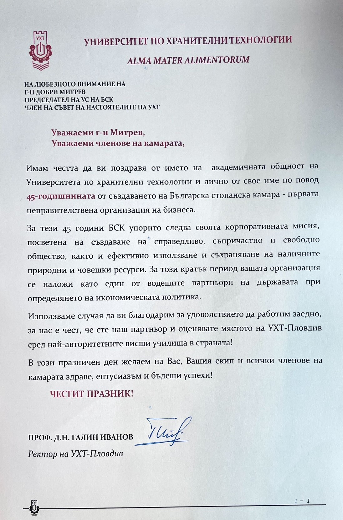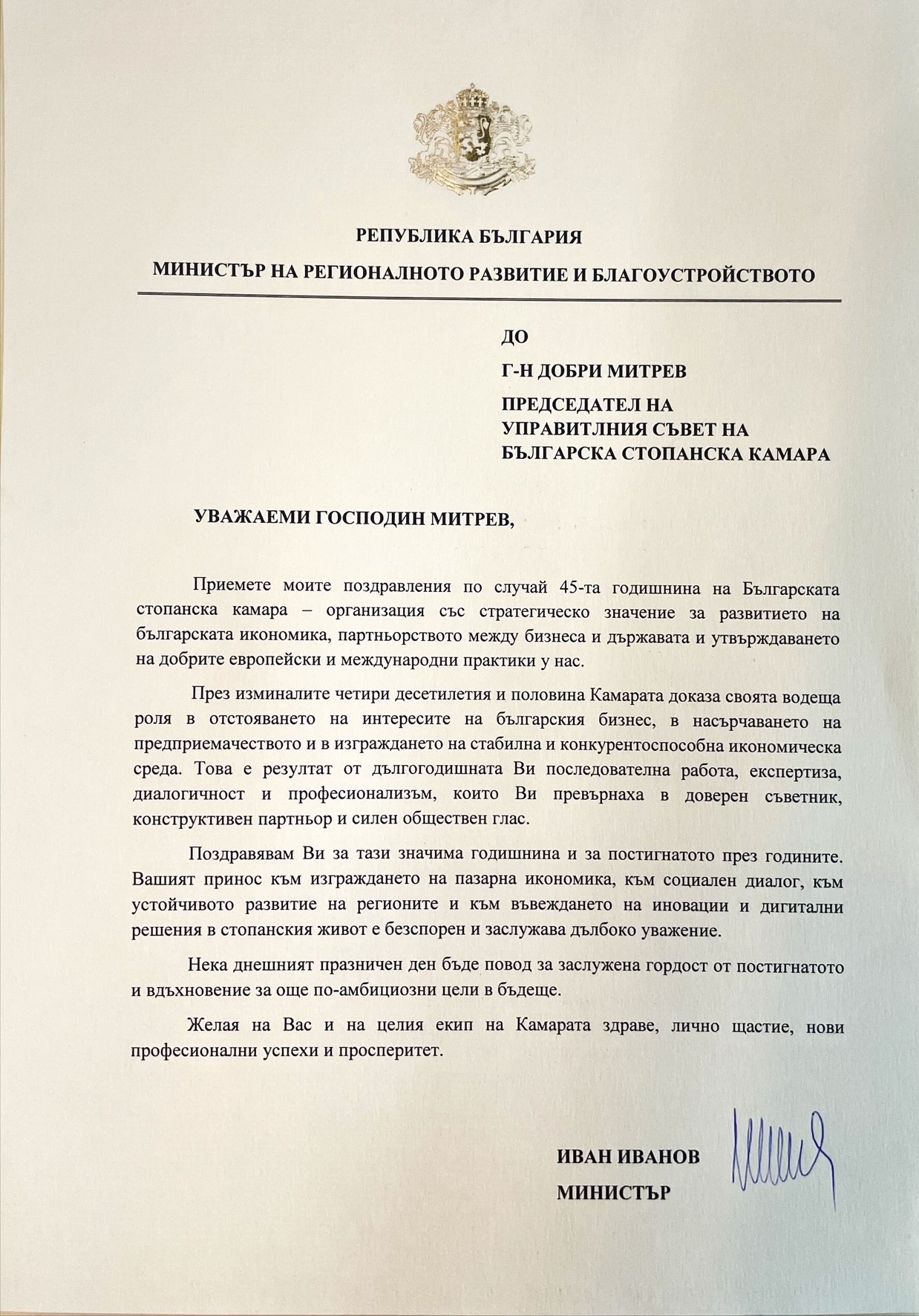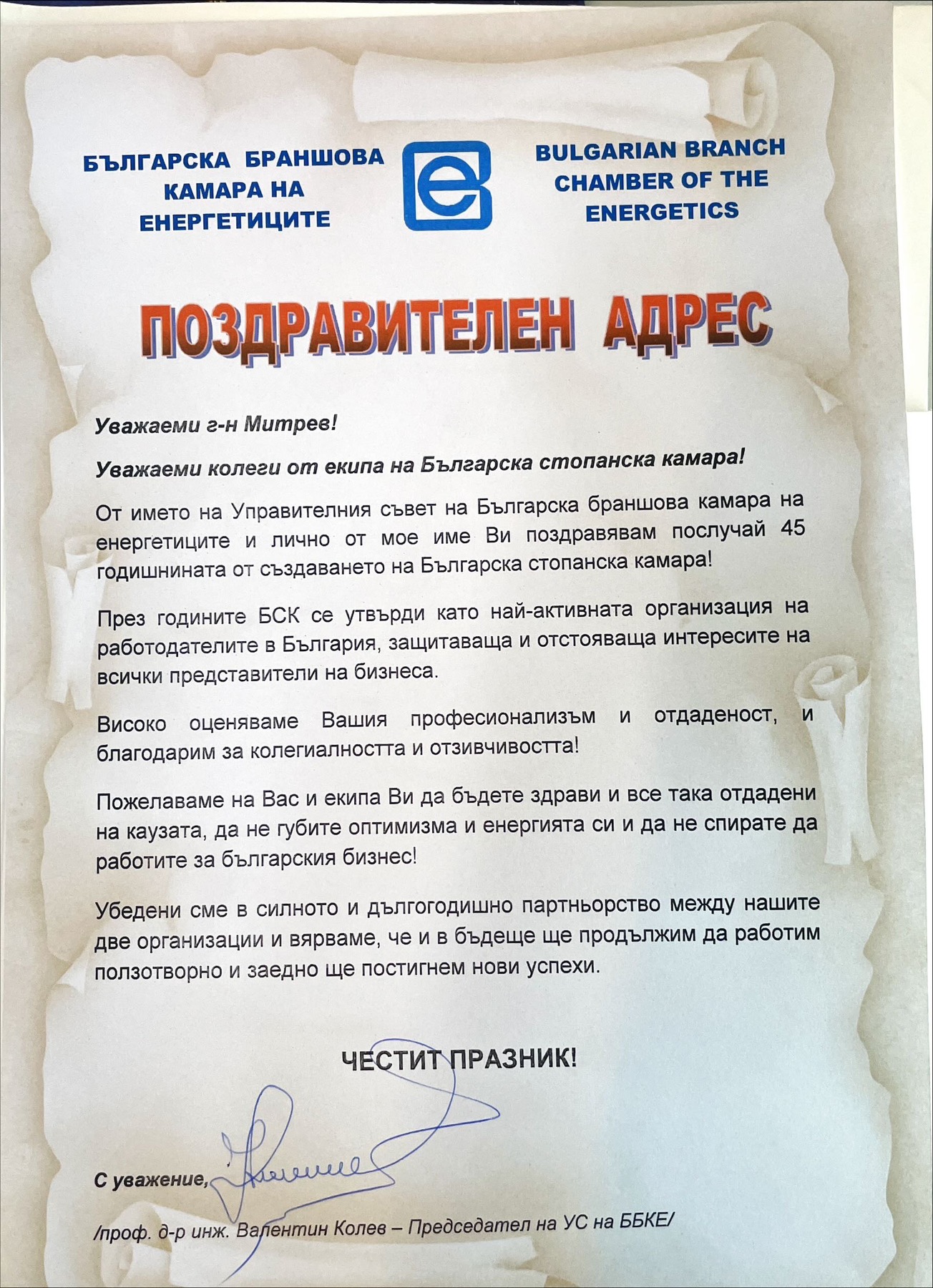 „За мен е истинско удоволствие да ви поздравя с вашия почти половин вековен юбилей – една внушителна възраст, която говори много за вашата много активна и ключова роля за прехода между плановото стопанство и пазарната икономика, за вашия принос за създаването на първите здравни и пенсионни фондове, за създаването на технологичните паркове към техническите университети, за създаването на Българската фондова борса и т.н. Винаги ме е впечатлявала вашата солидна експертиза, активната ви ангажираност със социално-икономическите проблеми и проницателната ви визия за развитието на нашата страна. Заслужава адмирации вашата визия за предвидима и ефективна нормативна среда, за конкурентен български бизнес, за устойчив растеж, базиран на иновации и технологии, за силно професионално образование, за равнопоставеност на видовете собственост – все важни условия за просперирането на българския бизнес. Специално искам да подчертая вашата роля на ценен партньор и коректив на институциите и важен участник в социалния диалог. Вашият глас не е само глас на бизнеса – с активната си роля през годините вие доказахте, че изразявате гласа на българското общество като цяло“, каза в приветствието си президентът Румен Радев. Държавният глава връчи на председателя на БСК Почетен знак на Президента на Република България „за приноса на Българската стопанска камара за развитието на съвременната ни икономика и нейния просперитет, както и за ползотворното сътрудничество с държавните институции в интерес на бизнеса и гражданите“.