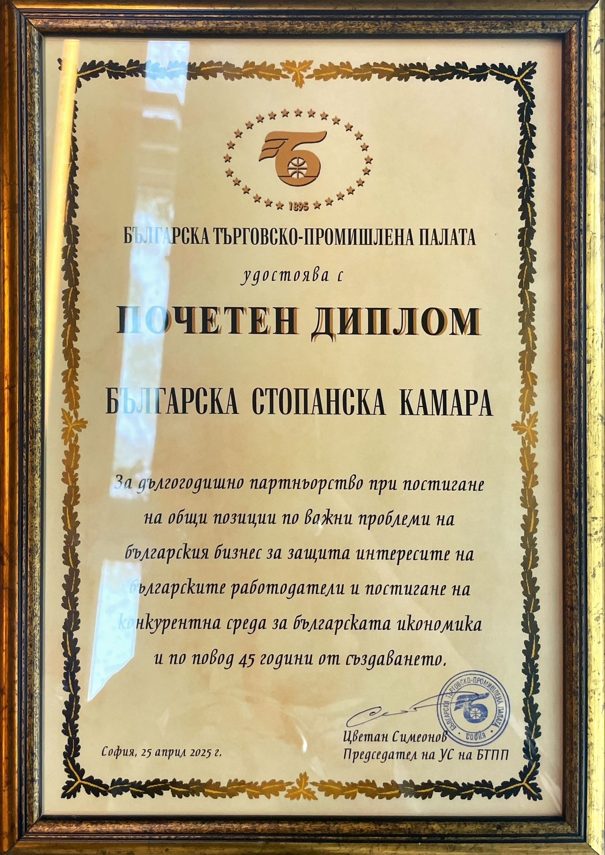 45 години от своето учредяване отбеляза с тържество на 25 април 2025 г. Българската стопанска камара. Гости на събитието бяха президентът на Република България Румен Радев, председателят на Народното събрание доц. д-р Наталия Киселова, вицепремиерът и министър на иновациите и растежа Томислав Дончев, министърът на енергетиката Жечо Станков, заместник-министри, ръководителите на Националния статистически институт, Националната здравно-осигурителна каса, Националния осигурителен институт, Комисията за финансов надзор, държавни агенции и други национални институции, народни представители, представители на България в Европейския парламент, ръководителят на Представителството на Европейската комисия в България - Йорданка Чобанова, представители на дипломатическия корпус, кметове на общини, ръководители на браншови и регионални организации, членуващи в БСК, управители и собственици на търговски дружества - членове на БСК, ръководителите на работодателските организации и на синдикатите, представители на медиите, бивши и настоящи служители на БСК.