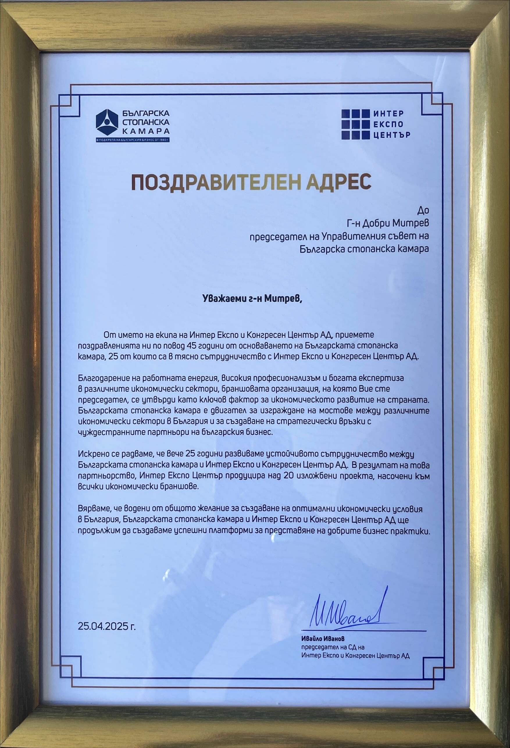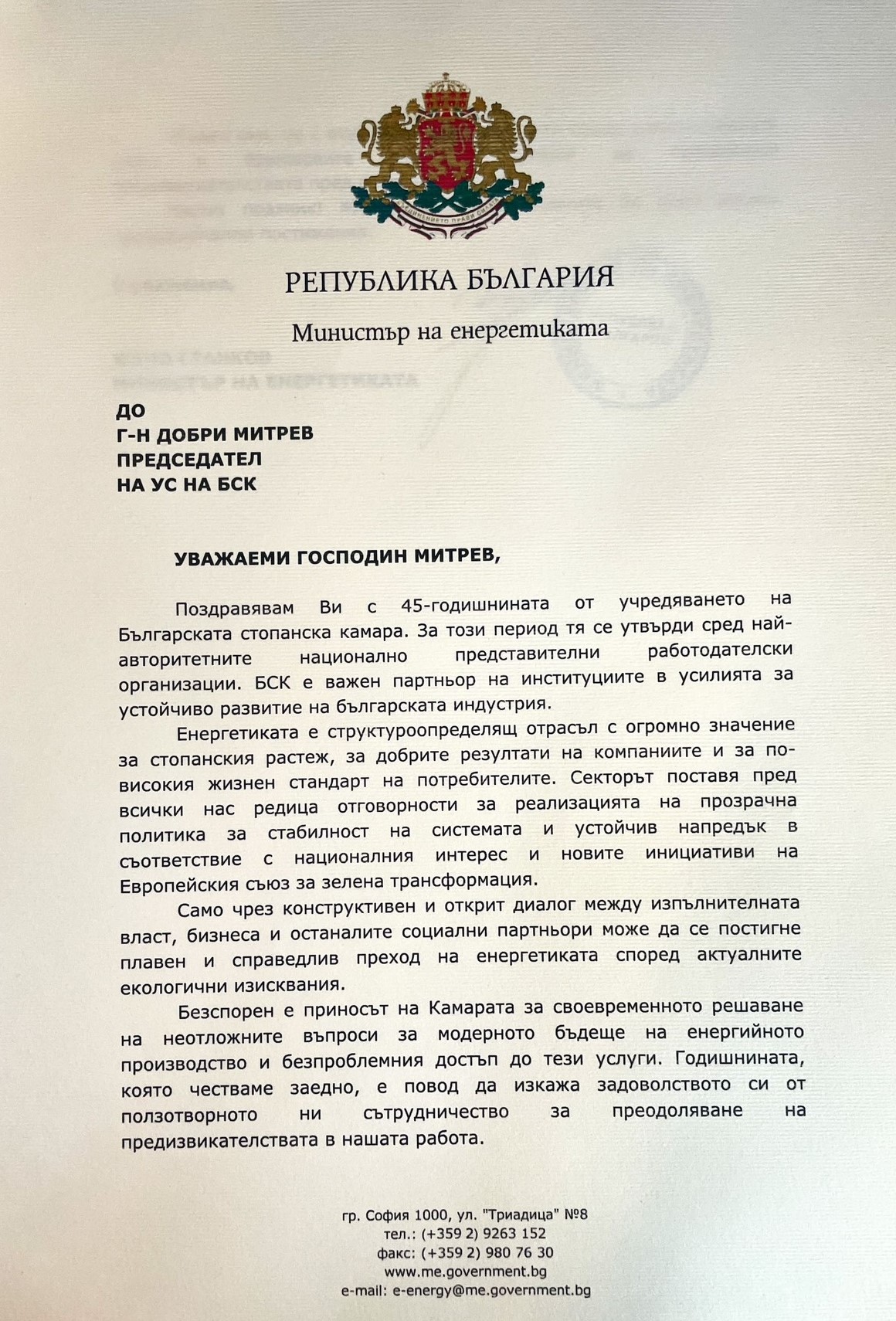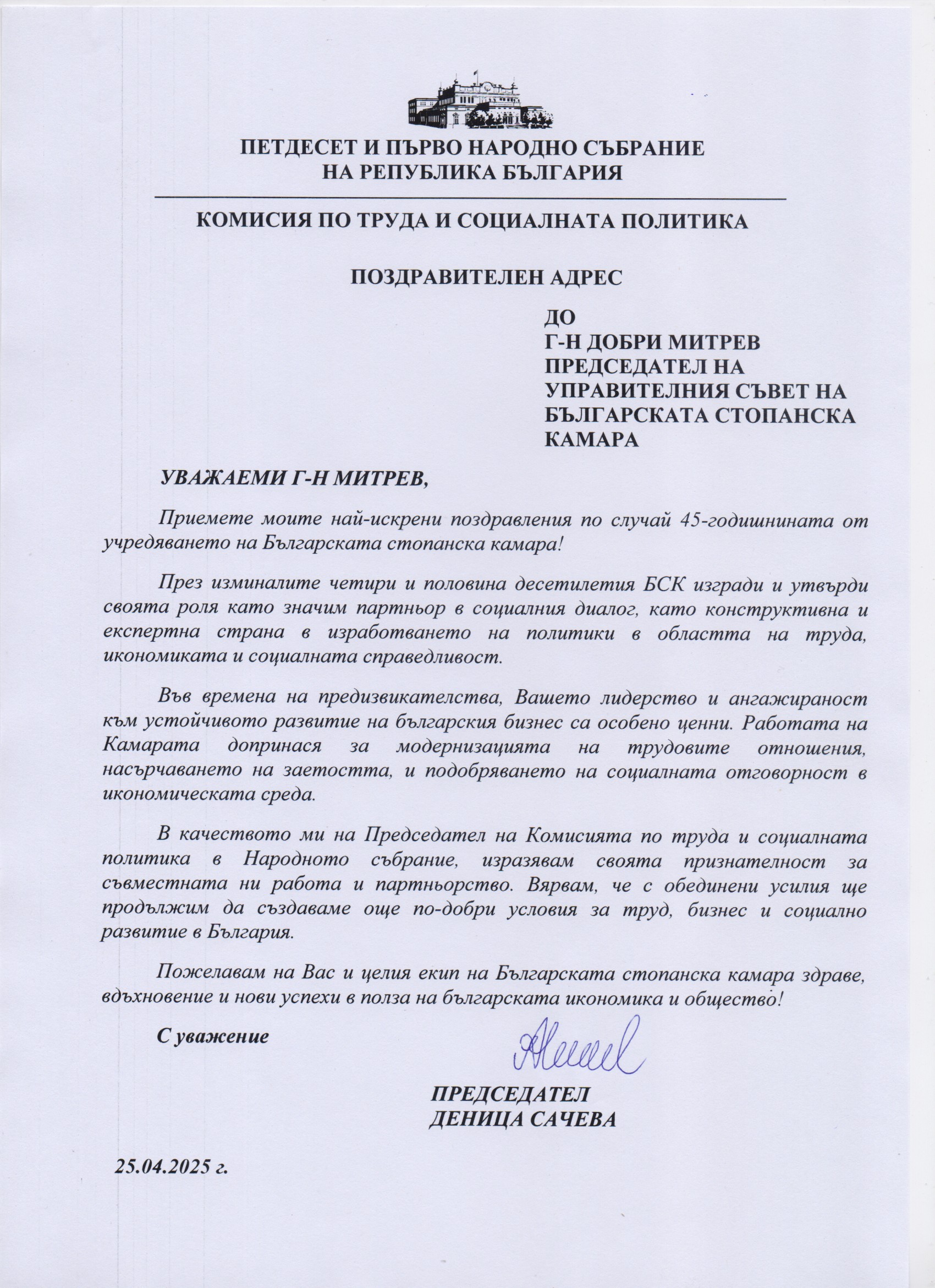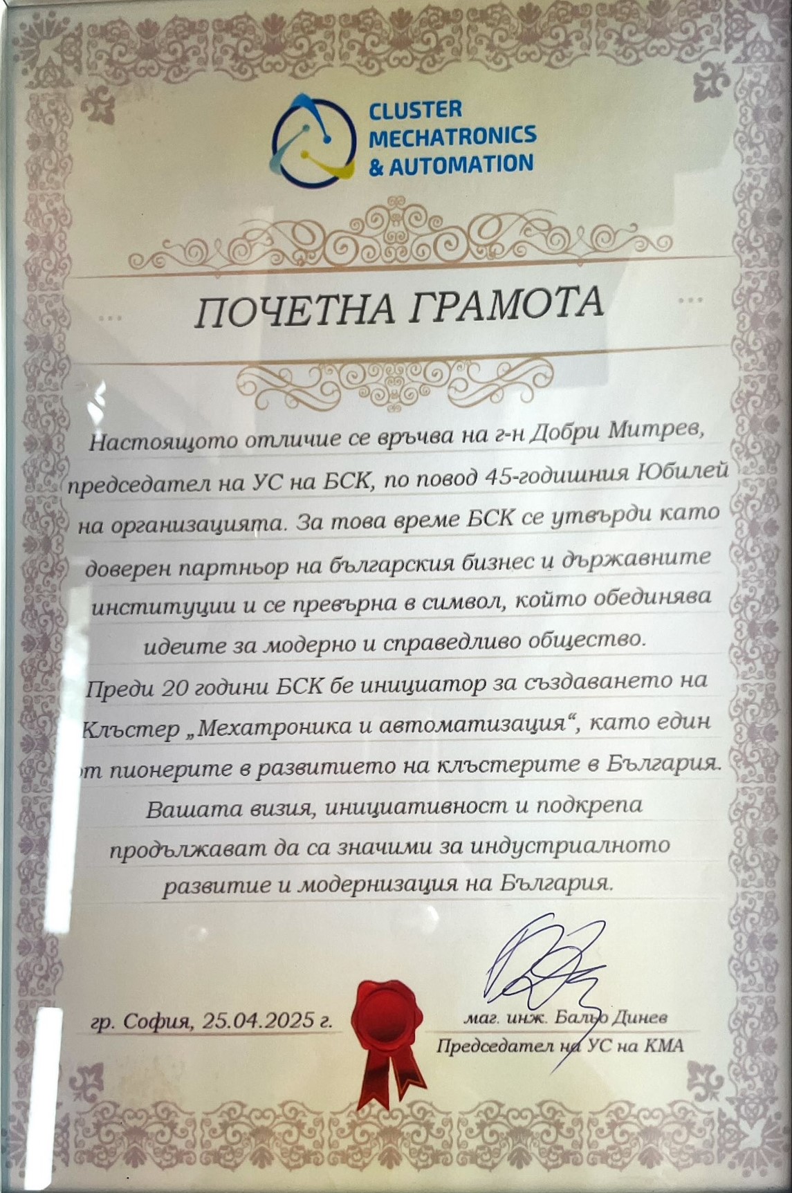 „Изключително задължаващо за мен е да бъда ръководител на организация като БСК, в чиято история стоят имена като тези на инж. Иван Пехливанов, Божидар Данев и Радосвет Радев – имена на истински лидери, които оставят трайна следа не само в историята на БСК, но в българската икономическа история изобщо. Днес, когато Камарата навършва 45 години, ние носим в себе си част от енергията на всеки един от тези лидери и следваме жалоните, които са ни заложили. Защото вярваме, че без почит към миналото не можем да имаме бъдеще“, отбеляза в приветствието си към гостите председателят на БСК Добри Митрев. Той направи кратка равносметка за мястото на БСК в най-новата икономическа история на България, като подчерта, че днес ролята на БСК е още по-отговорна. „Ние сме тук, за да чуваме гласа на бизнеса – без превод, без редакция. Ние сме тук, за да предлагаме, а не да се оплакваме. Ние сме тук, за да помагаме на държавата да чува, но и на бизнеса да разбира. Нашето бъдеще минава през: нови модели на работа и образование, устойчив преход към зелена икономика и дигитализация, и преди всичко – ясна стратегия за развитие на България като страна, в която бизнесът не оцелява, а просперира“, каза Добри Митрев.