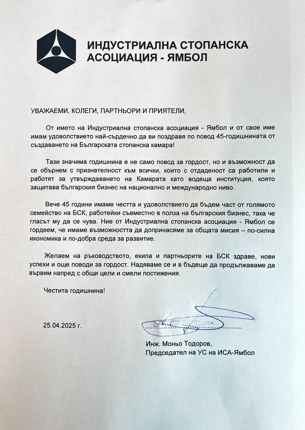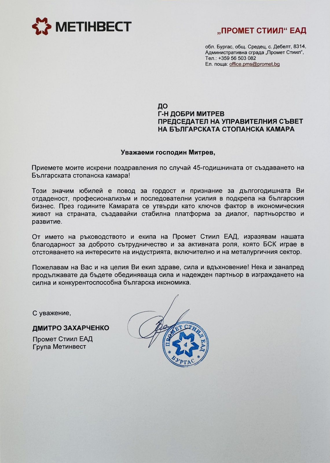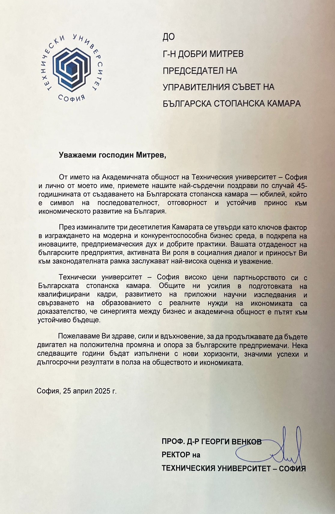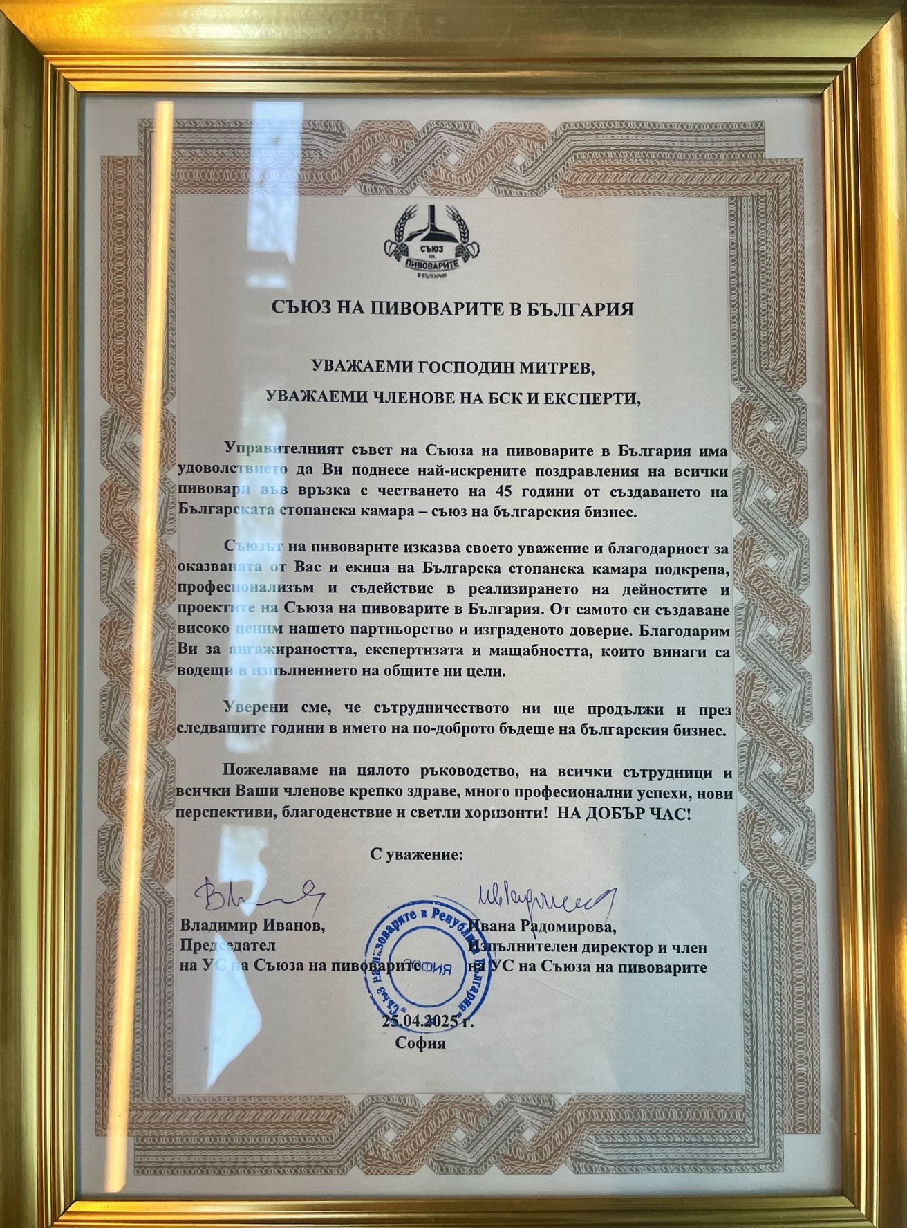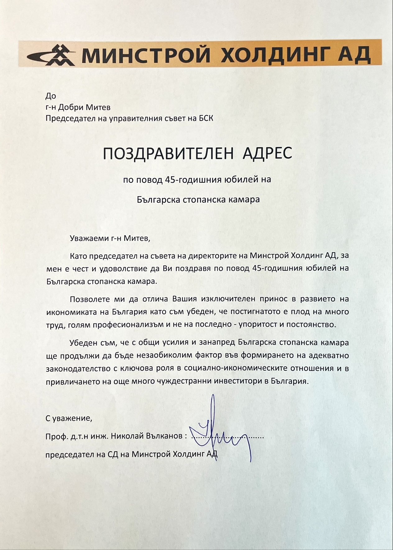 „Изключително задължаващо за мен е да бъда ръководител на организация като БСК, в чиято история стоят имена като тези на инж. Иван Пехливанов, Божидар Данев и Радосвет Радев – имена на истински лидери, които оставят трайна следа не само в историята на БСК, но в българската икономическа история изобщо. Днес, когато Камарата навършва 45 години, ние носим в себе си част от енергията на всеки един от тези лидери и следваме жалоните, които са ни заложили. Защото вярваме, че без почит към миналото не можем да имаме бъдеще“, отбеляза в приветствието си към гостите председателят на БСК Добри Митрев. Той направи кратка равносметка за мястото на БСК в най-новата икономическа история на България, като подчерта, че днес ролята на БСК е още по-отговорна. „Ние сме тук, за да чуваме гласа на бизнеса – без превод, без редакция. Ние сме тук, за да предлагаме, а не да се оплакваме. Ние сме тук, за да помагаме на държавата да чува, но и на бизнеса да разбира. Нашето бъдеще минава през: нови модели на работа и образование, устойчив преход към зелена икономика и дигитализация, и преди всичко – ясна стратегия за развитие на България като страна, в която бизнесът не оцелява, а просперира“, каза Добри Митрев.