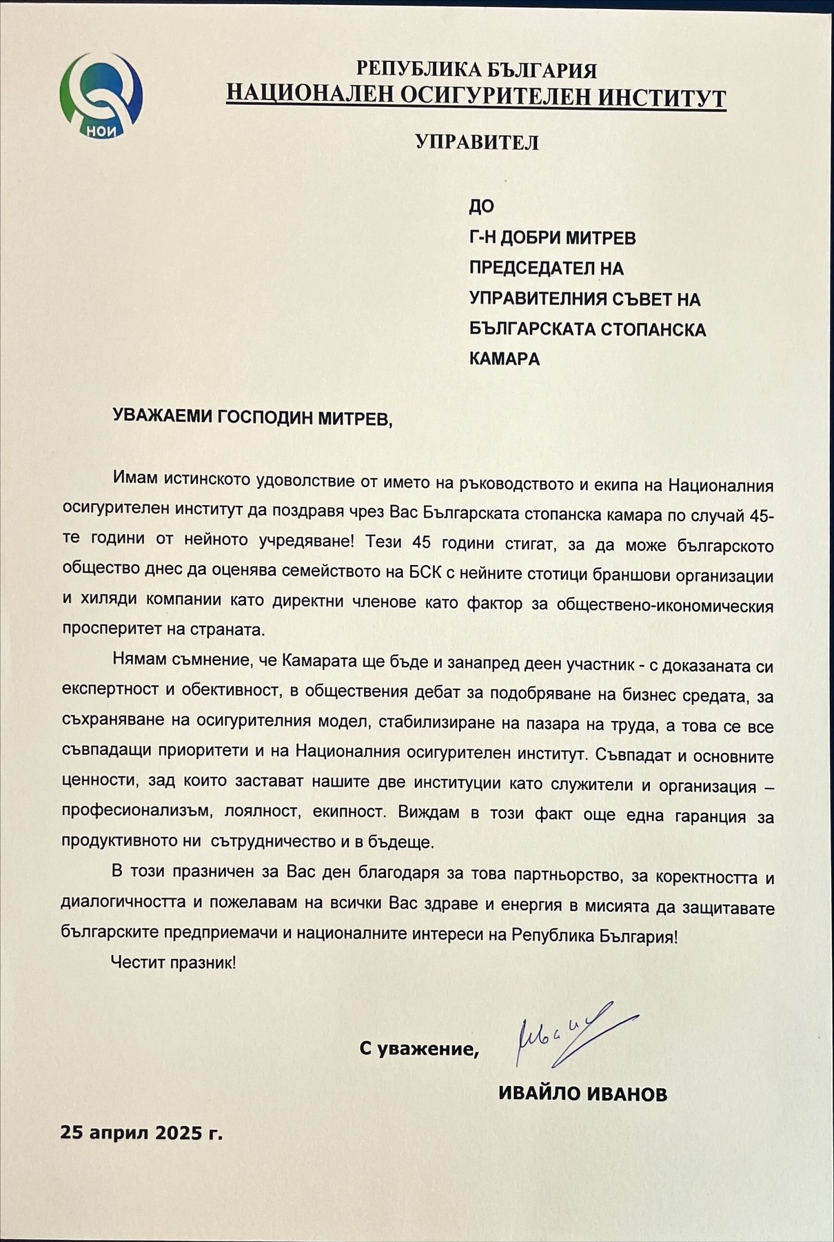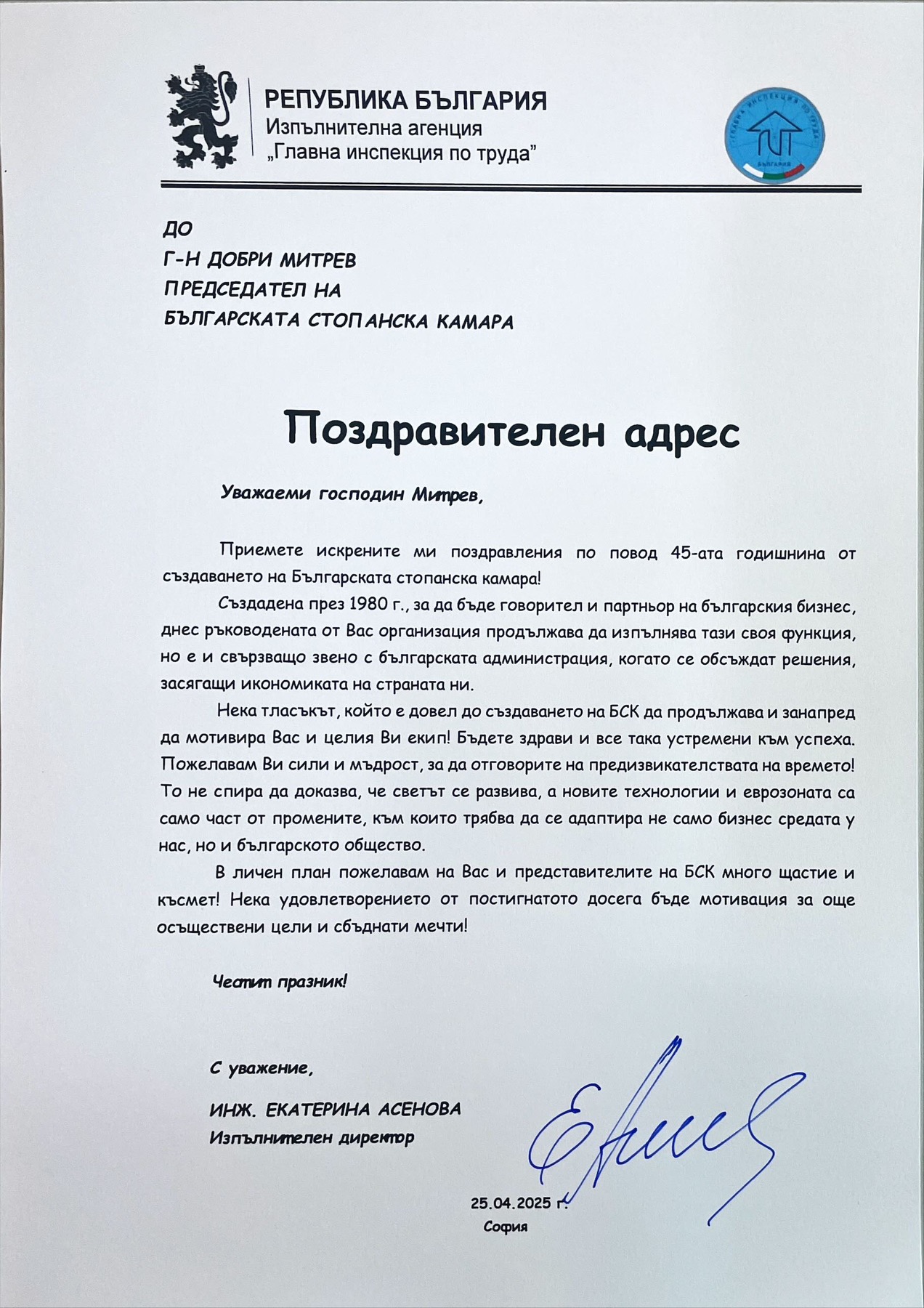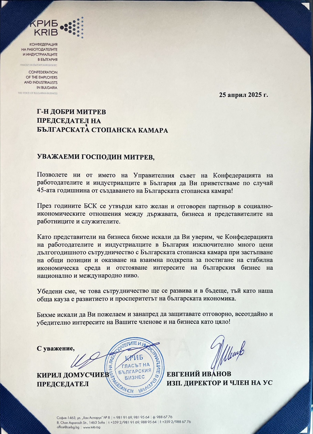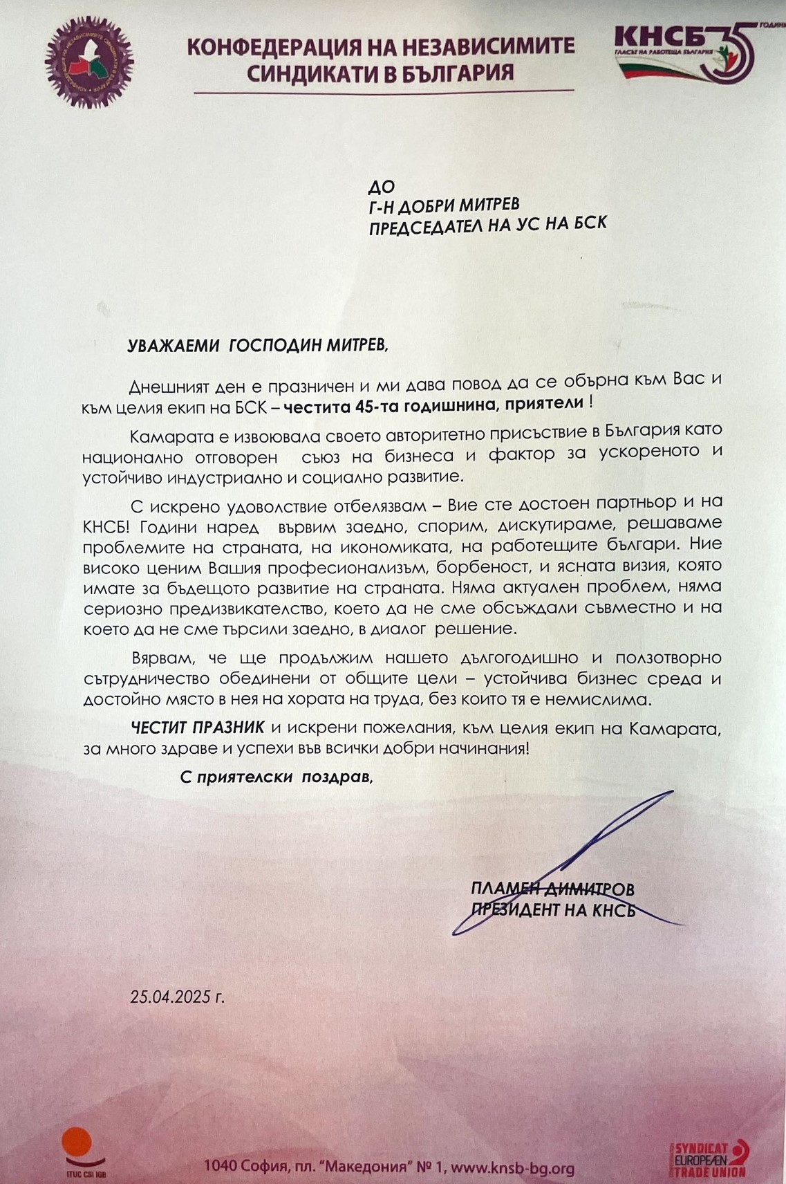 „Често изпадаме в спорове и несъгласия, но винаги сме работили в известна симбиоза, защото бизнесът не може без работници и работниците не могат без работодатели. Пожелавам си и занапред да намираме заедно правилните решения, така че да гарантираме достойни доходи на българските граждани“, подчерта президентът на КНСБ Пламен Димитров.