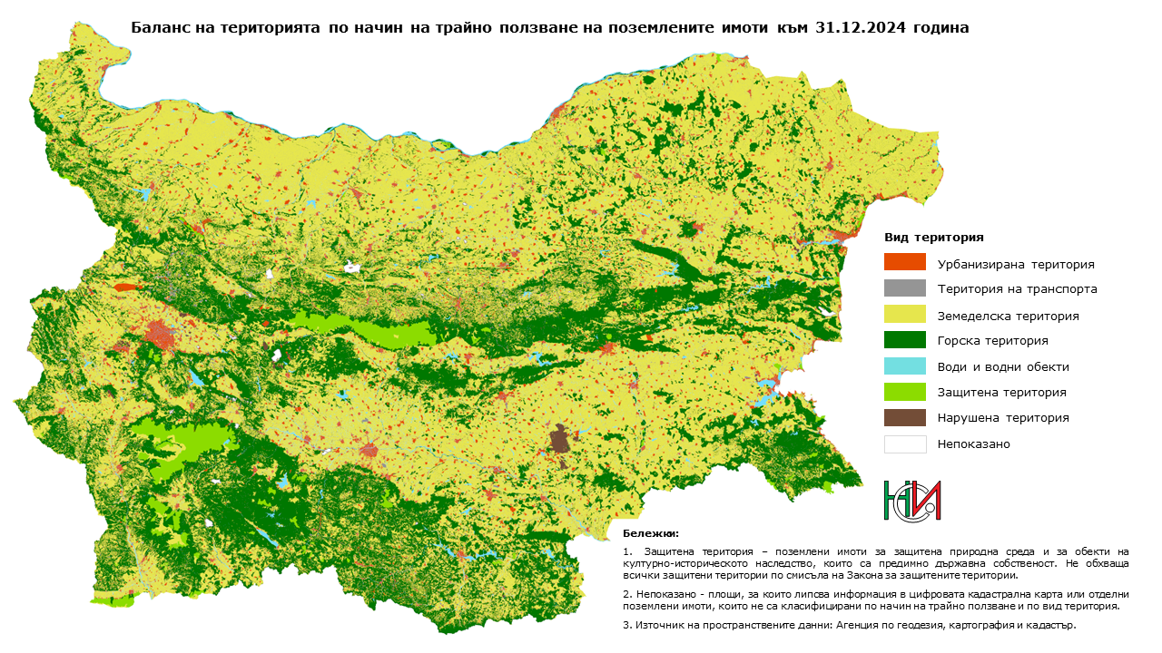 Към 31 декември 2024 г. територията на Република България, изчислена от Националния статистически институт на базата на цифрови модели на кадастралната карта на страната, е 110 996.76 кв. километра. Според начина на трайно ползване (конкретно предназначение) на поземлените имоти най-голяма площ заемат земеделските територии - 54.5%, и горските територии - 33.3% от общата площ на страната. Урбанизираните територии обхващат близо 5 279.4 кв. км, или 4.8% от територията на страната.