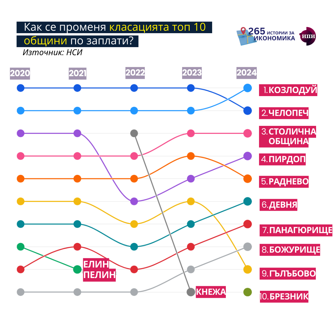 Община Козлодуй излиза на първо място по ниво на възнагражденията в страната през 2024 г., като средната заплата в местната икономика достига 1 971 евро на месец. Близо 70% от всички наети в общината работят в обществения сектор, като тук влизат и всички наети в АЕЦ Козлодуй. Други две общини със силна енергетика също попадат в топ 10 – това са Раднево на 5-то място (1 409 евро) и Гълъбово на 9-то място (1 289 евро). Символично, в период на тежки дискусии за заплащането в публичния сектор, община с голямо държавно предприятие излиза на първо място по заплати в страната.
