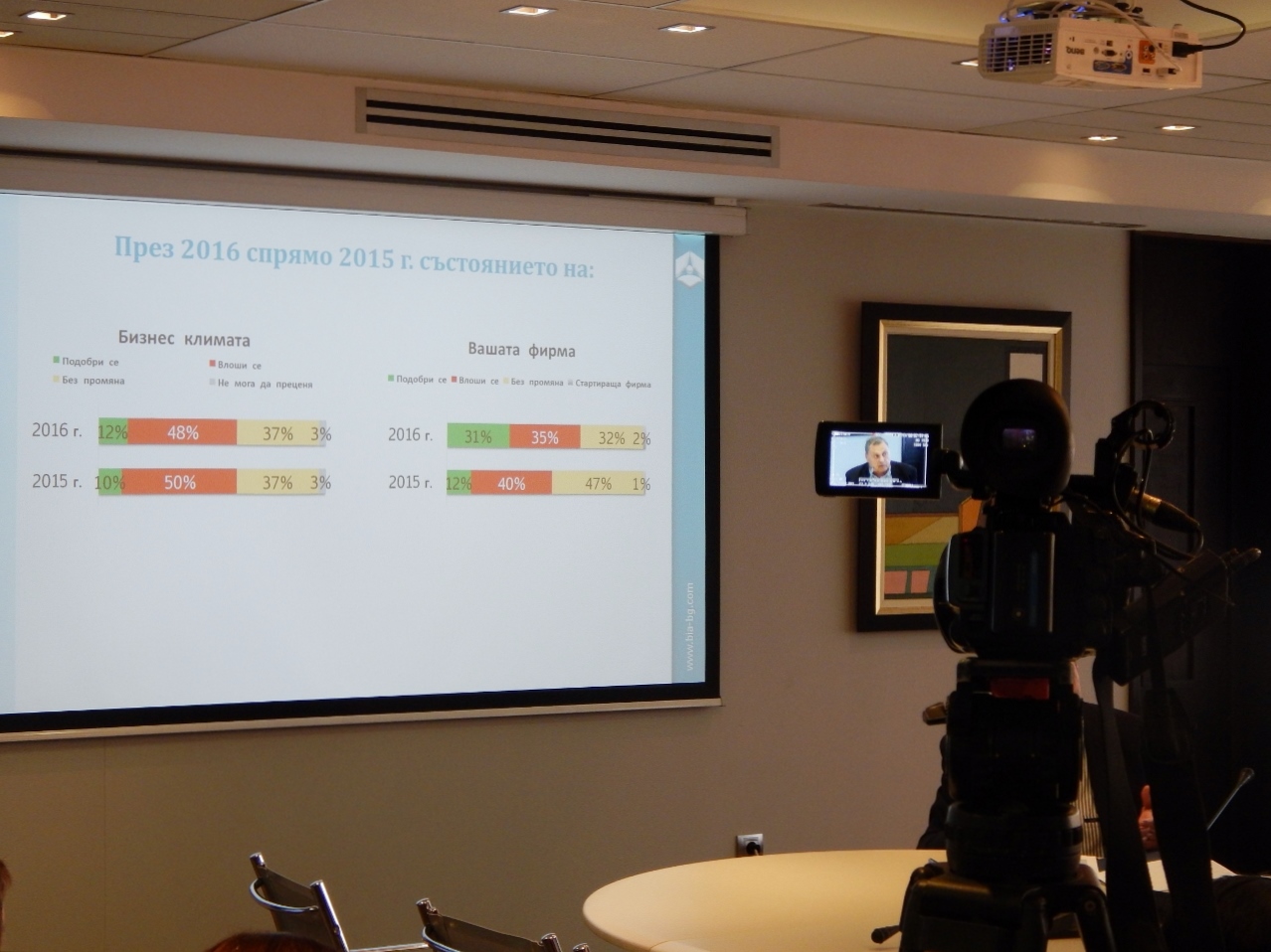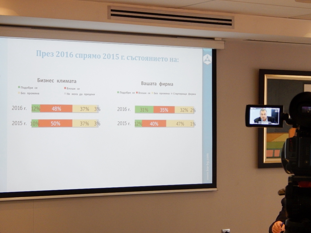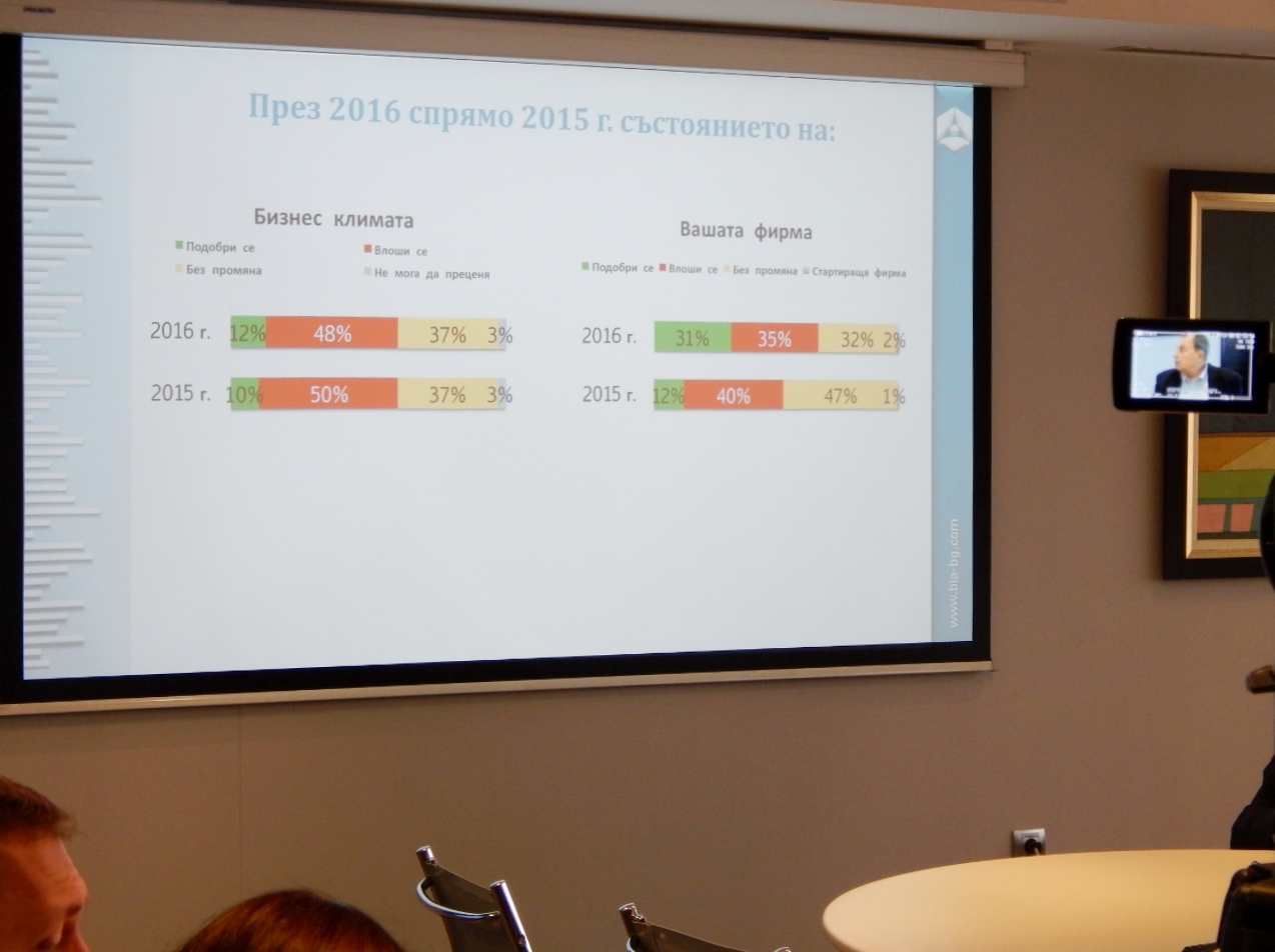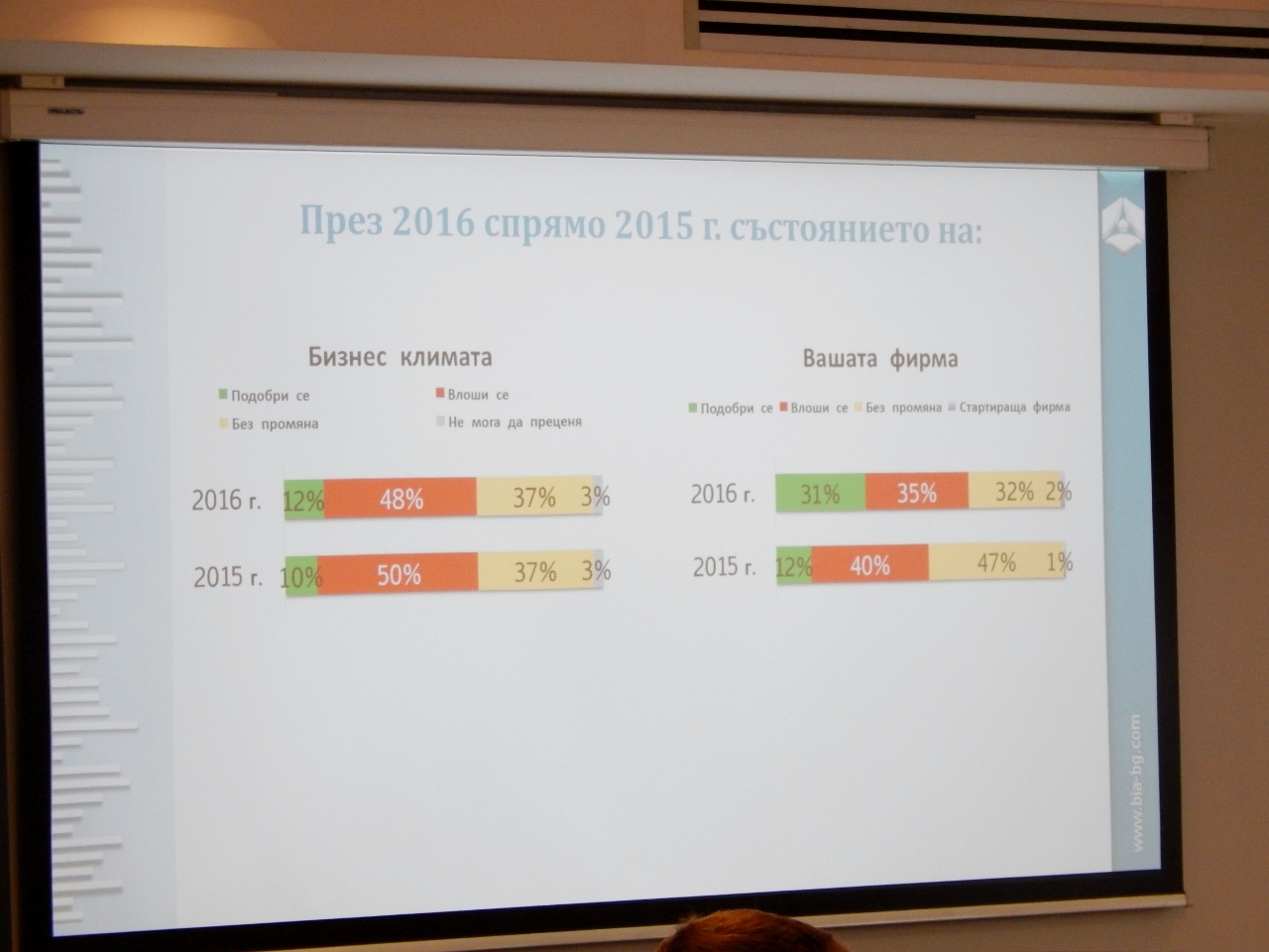 Подобрява се и състоянието на фирмите. Докато през 2015 г. процентът на деклариралите подобрение на фирменото състояние е едва 12%, то през 2016 г. позитивна оценка дава всеки трети анкетиран. Все още, обаче, остава висок делът (35 %) на фирмите с влошаващи се показатели.
