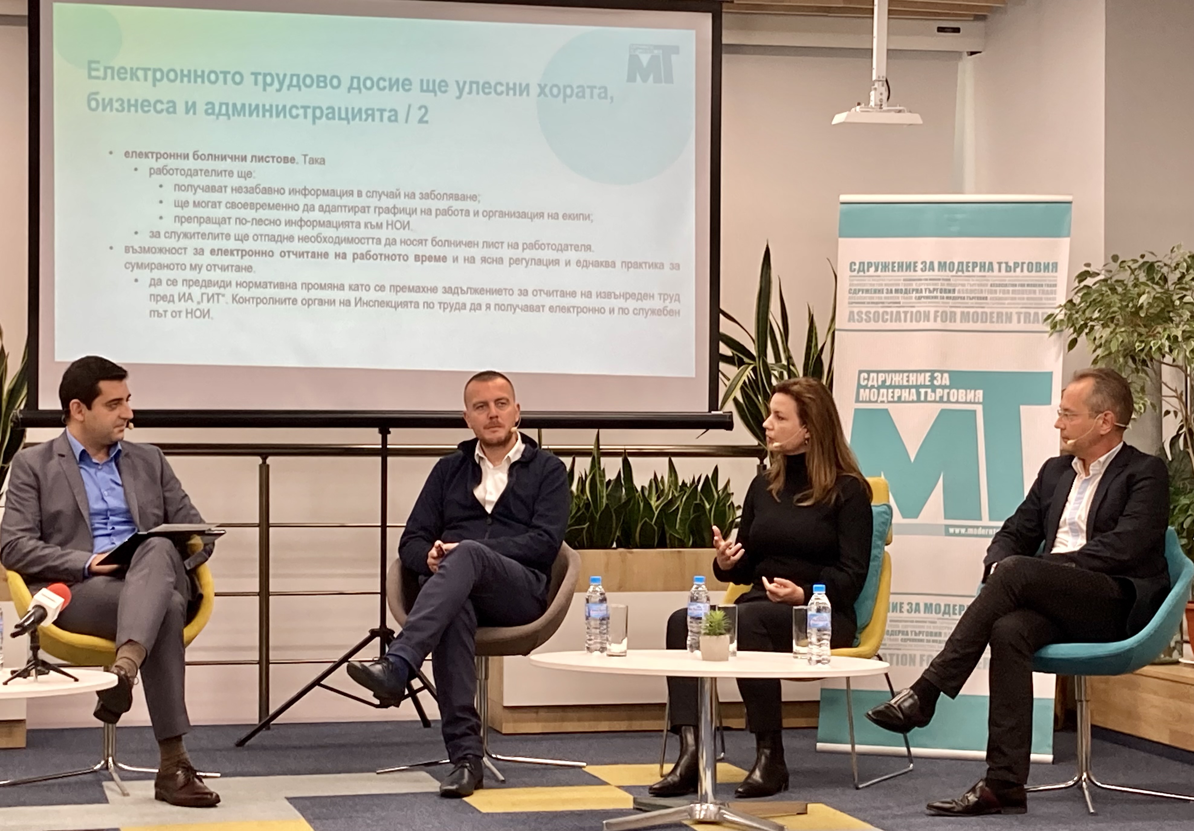 С дигитализация пазарът на труда ще бъде в полза на служителите, на работодателите и на държавния бюджет. В това бяха единодушни: Андрей Александров- експерт по трудово право, Петър Ганев - старши изследовател ИПИ, Мария Минчева - зам.-председател на БСК, Николай Вълканов -изпълнителен директор на СМТ. Те бяха участници в Панел 2, посветен на дигитализацията в трудово-отчетните процедури и документи по време на информационния ден, който организира Сдружението за модерна търговия на тема "Защо търговските вериги са предпочитан работодател".