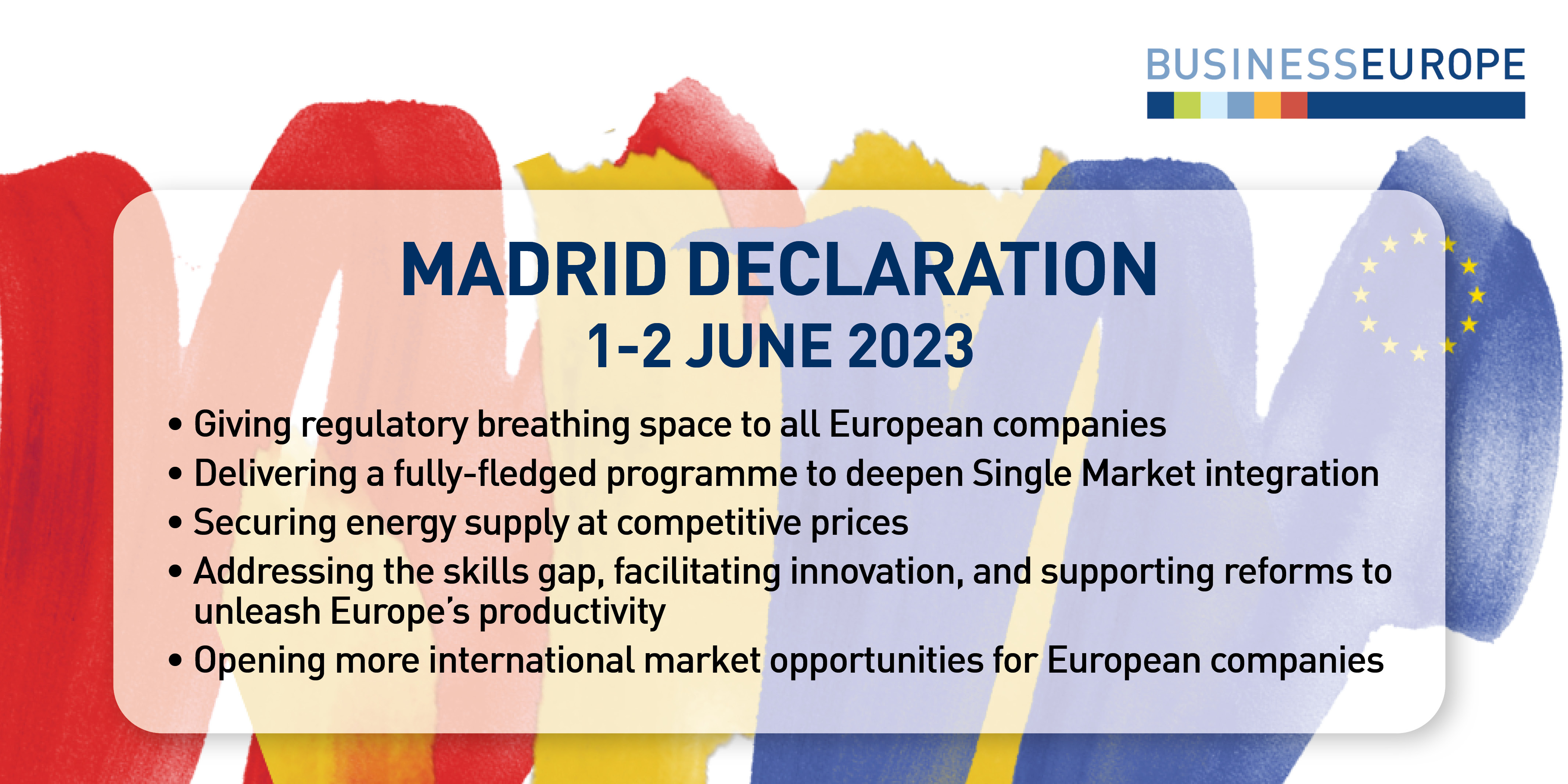 Късно снощи Съветът на президентите прие своята Мадридската декларация, съдържаща ключовите послания и очаквания на европейския бизнес към Испанското председателство. Декларацията можете да прочетете ТУК.