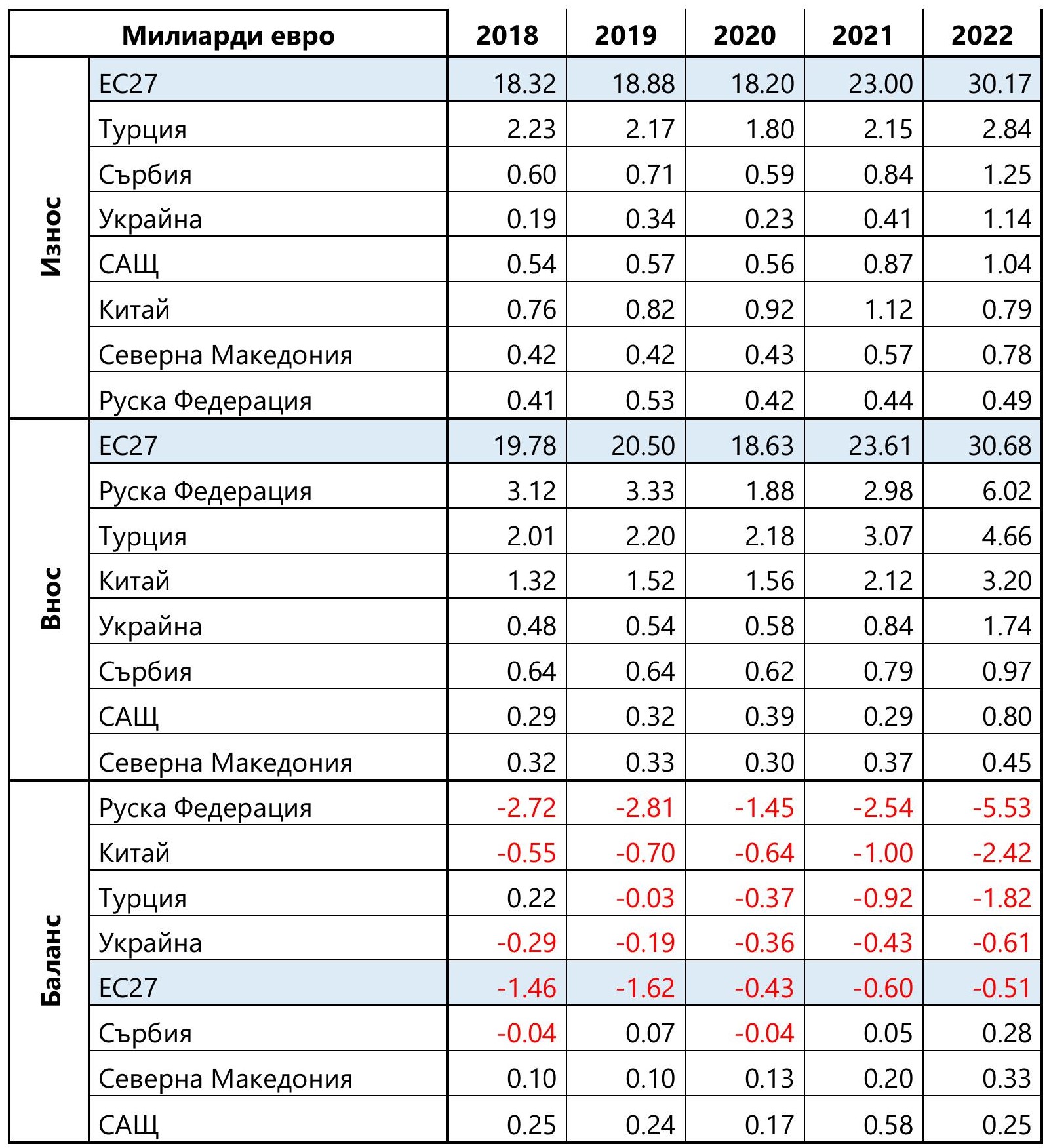 През 2022 г. България удвоява отрицателното си салдо (т.е. повече купува, отколкото продава) с Руската федерация, Китай и Турция. Отрицателното ни салдо с Украйна е увеличено с 41%, а положителното със САЩ намалява наполовина. Сравнително добре се развива търговията ни със съседките Сърбия и Северна Македония.