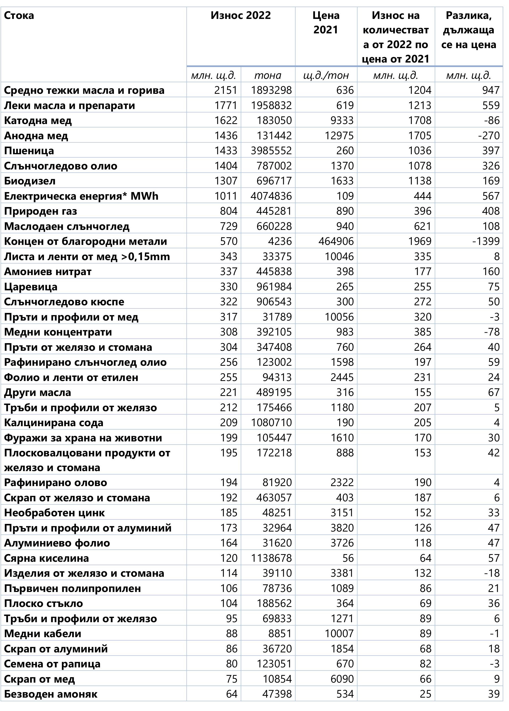 За да обективизираме успехите ни в износа, разгледахме 40-те водещи суровини и борсови стоки, като умножихме количествата за 2022 г. по цените през 2021 г. Резултатът е износ, по-малък с 2 507 млн. щ.д. Това означава, че ръстът в износа, дължащ се на променени цени на суровини и борсови стоки, е 6%. От повишените цени най-много печелят горивата, електроенергия, природният газ, пшеницата и слънчогледът. От друга страна, стоки, които през 2021 г. са били със значително по-високи цени спрямо 2022 г., са концентратите на благородни метали и медта.